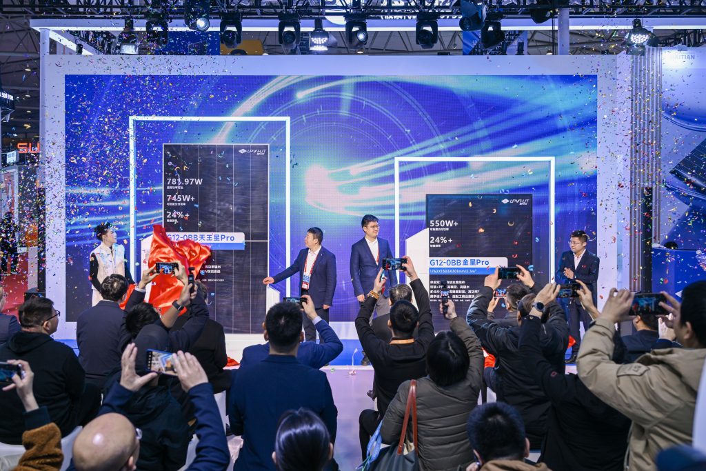 在现场所有嘉宾的见证下,琏升光伏科技有限公司董事长王新,琏升光伏科技有限公司副总裁唐豆豆,眉山琏升光伏科技有限公司总经理蒋万昌,琏升光伏科技有限公司研发总监汤安民共同揭幕了全新G12-0BB天王星Pro和金星Pro组件。